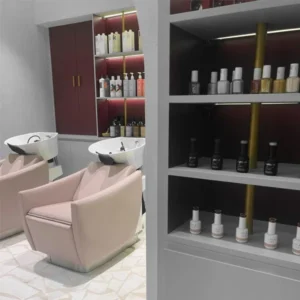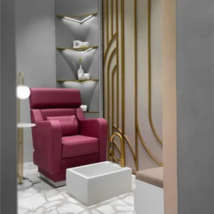 This Hair Salon is one of our favorites in terms of design and colors. The use of pep colors such as pink or fuchsia gives a strong visual identity to the Hair Salon. In particular, the choice of our furniture lounge clearly marks the design and fresh side of this space. The choice of the Mademoiselle range from Cindarella Paris brand gives a real design effect, our collection is not only comfortable and stylish but it is also practical for your technicians. And finally, the choice of the pedicure Chair Uniko gives a lively and fresh effect. Uniko is one of our best sellers, with a USB port to allow your customers to recharge their phones in peace, and electric backrest to position your customers as you wish
